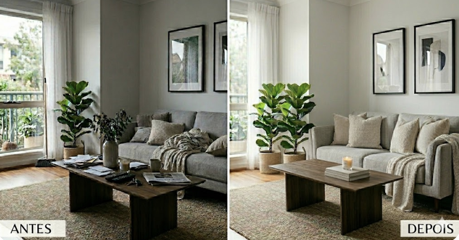 Dica: Retire poltronas que bloqueiam passagens ou mesas de centro que fazem o ambiente parecer menor. O objetivo é maximizar o metro quadrado visual.